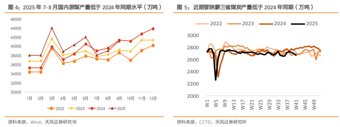 供给端方面,“查超产”政策已使得煤炭行业供需格局显著改善。数据显示,2025年7-8月,国内原煤产量同比转跌,跌幅分别为3.8%和3.2%,年内供需累计盈余由1-6月的9629万吨迅速降为1-8月的1496万吨。