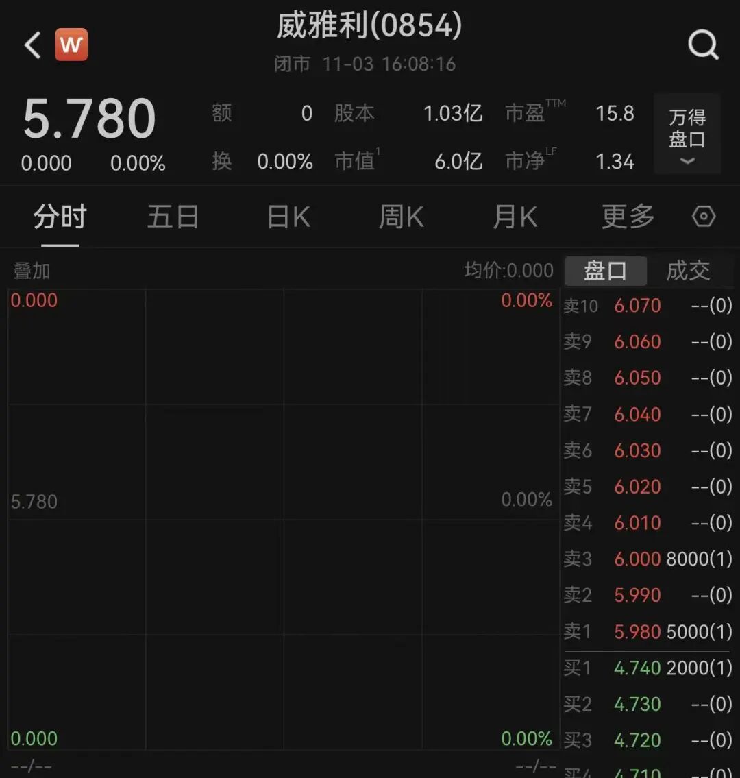 二级市场上,截至11月3日收盘,威雅利股价报5.78港元,最新市值为5.95亿港元。