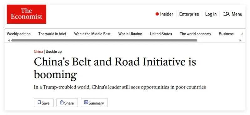 最后值得一提的是,除了CNN这篇报道中呈现的数据图表,英国《经济学人》杂志还在本月的一篇报道中谈到了中国 “蓬勃发展”的“一带一路”在这一轮中美博弈中发挥的积极作用,称共建“一带一路”倡议促进了中国的贸易多元化。