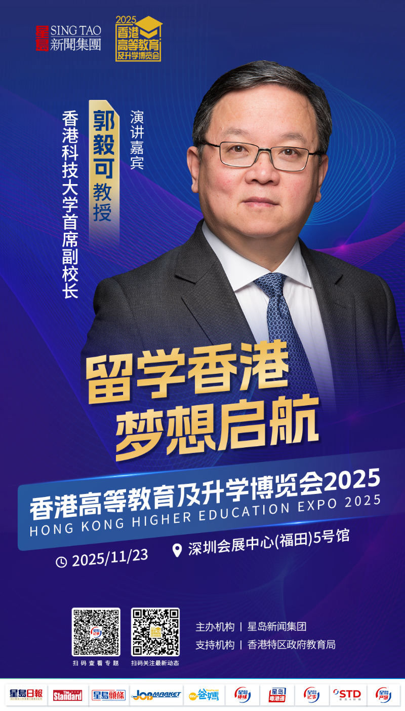 11月23日,星岛新闻集团将再度联合15所香港高校,精心打造 “香港高等教育高峰论坛”,推动粤港澳大湾区教育融合发展,分享香港高校特色亮点与招生最新资讯。香港科技大学将重磅亮相 “香港高等教育及升学博览会2025”,届时香港科技大学首席副校长郭毅可教授将出席博览会并发表主题演讲。
