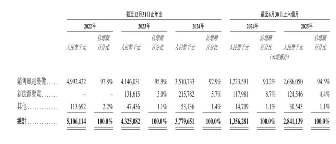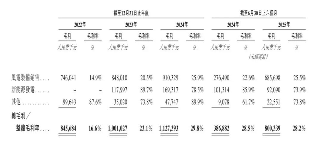 大金重工核心的收入来源仍是风电装备,各期业务收入占比总收入的97.8%、95.9%、92.9%及94.5%。2023年起,新能源发电业务开始为大金重工创造收入,2023年-2025年上半年分别贡献了3.0%、5.7%及4.4%的收入。