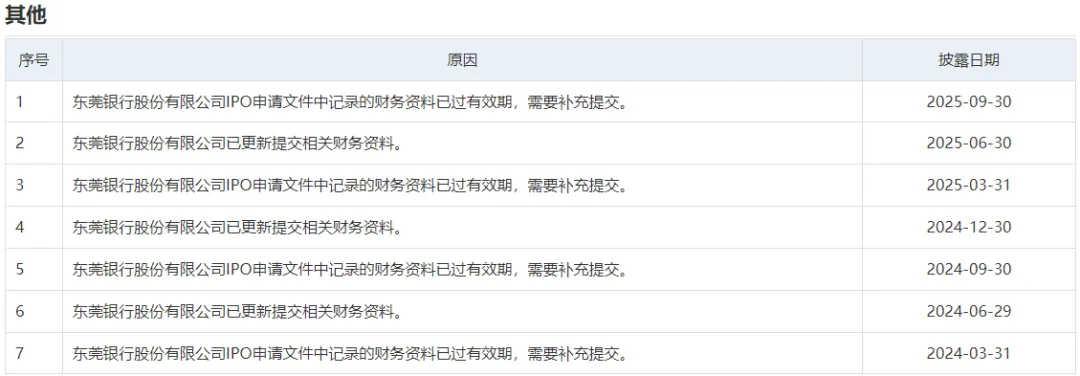 然而,流程上的推进并未带来实质性的突破。在过去两年多时间里,东莞银行的IPO进程陷入了“财务资料过期→中止→更新→恢复→再次过期”的循环。尤为关键的是,其审核状态长期停滞在初期,截至目前的公开信息显示,仍未进入首轮问询环节,这也意味着东莞银行的上市材料甚至还未开始接受交易所的实质性审视。