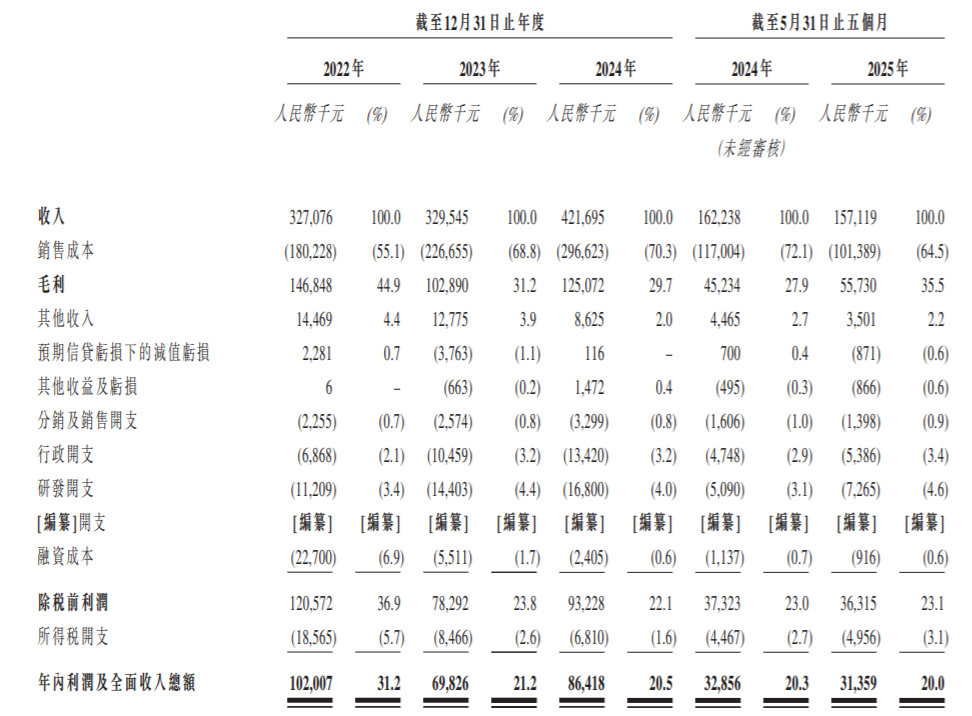 业绩方面,2022年、2023年、2024年及2025年前5个月,海伟电子营业收入分别为3.27亿元、3.30亿元、4.22亿元及1.57亿元,相应的净利润分别为1.02亿元、0.70亿元、0.86亿元及0.31亿元。