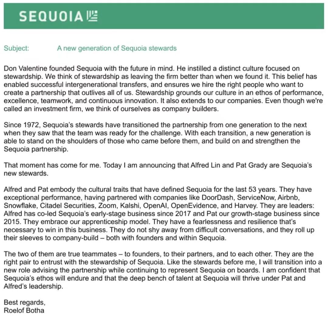 近日,担任红杉资本掌门人仅三年多的Roelof Botha(罗洛夫·博塔)宣布辞去全球领导人(Senior Steward)职务,由Alfred Lin(林君叡)及Pat Grady(帕特·格雷迪)接任,并联合管理红杉资本。