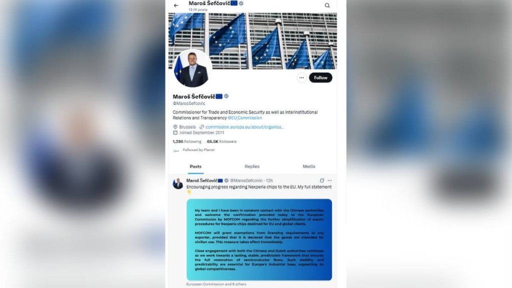 欧盟贸易和经济安全委员谢夫乔维奇周六在社交平台发文表示,确认中国商务部已同意进一步简化安世芯片出口至欧盟及全球其他客户的程序,只要能确认芯片用于民用用途,中方便会发出限制出口豁免许可,措施即时生效。