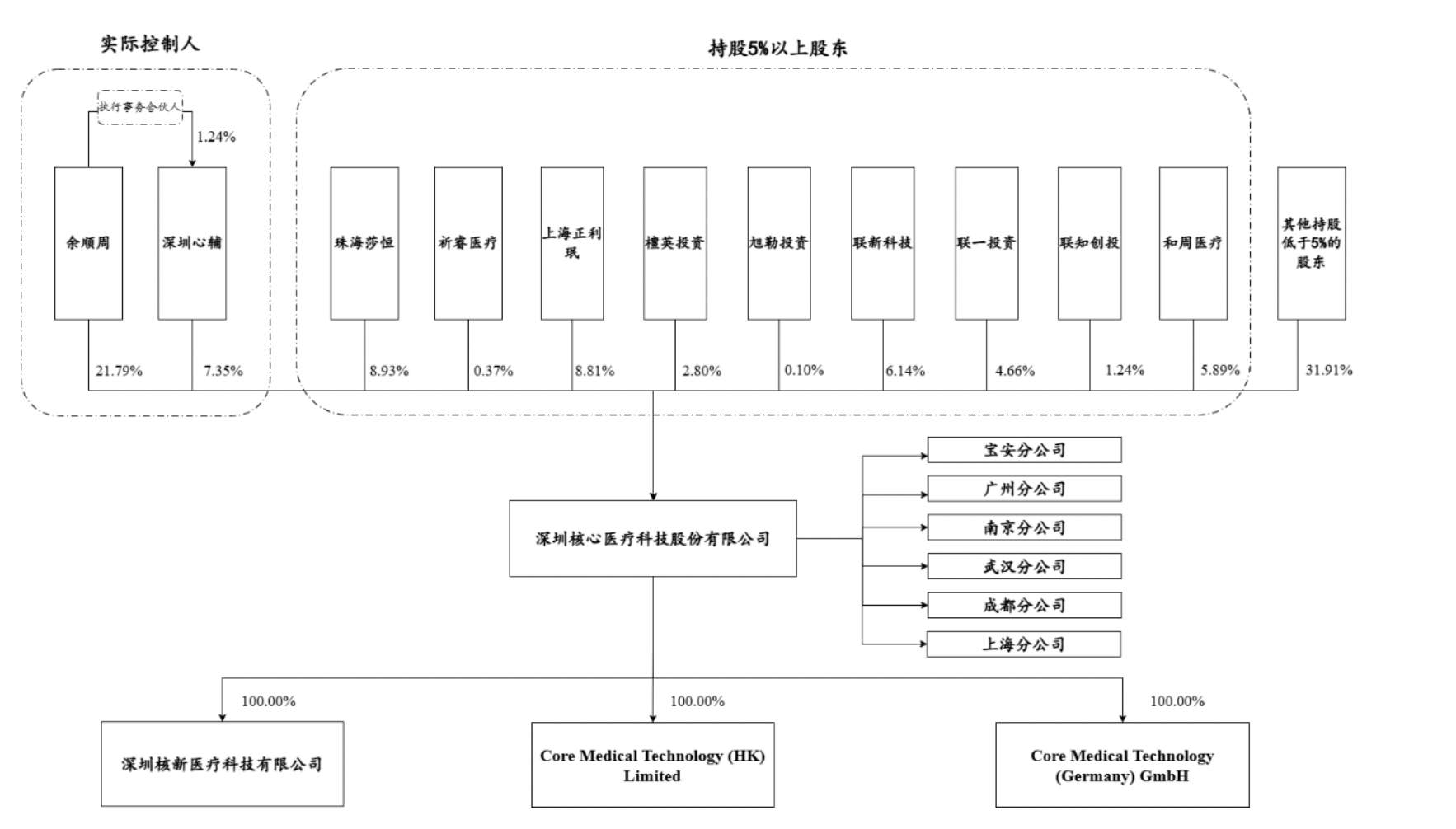 核心医疗的控股股东、实际控制人为自然人余顺周。截至本招股说明书签署日,余顺周直接持有公司21.79%的股份且通过深圳心辅间接持有公司0.09%股份,并作为持股平台的执行事务合伙人通过深圳心辅控制公司7.35%的表决权,合计控制公司29.14%的表决权。