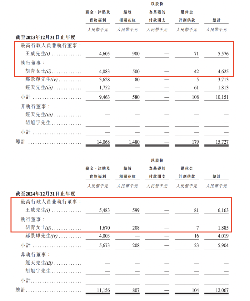 薪酬方面,2023年、2024年及2025年上半年,王威薪酬分别为557.6万元、616.3万元、309.8万元,胡青薪酬分别为462.5万元、188.5万元、0元。