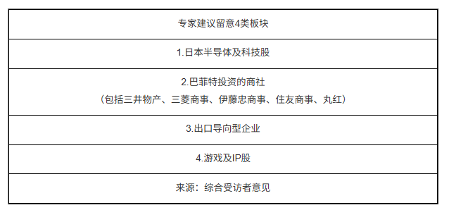 卢楚仁称,尽管日本股市大趋势向好,但投资者适宜等出现调整时候才趁低吸纳较为适合。他建议,投资者可优先选择日本的半导体及科技股板块,又或者股神巴菲特买入的商社,包括三井物产(日股编号:8031)、三菱商事(日股编号:8058)、伊藤忠商事(日股编号:8001)、住友商事(日股编号:8053),以及丸红(日股编号:8002)。但假设投资者没有心仪的个股,则可以考虑买入日股的ETF。