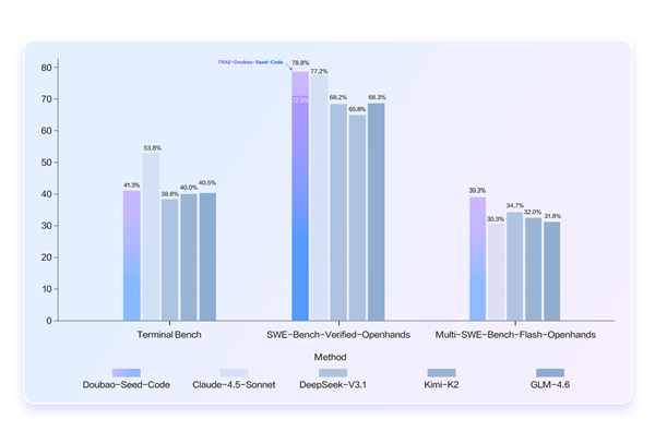 据了解,豆包编程模型面向Agentic编程任务进行深度优化,在Terminal Bench、SWE-Bench-Verified-Openhands、Multi-SWE-Bench-Flash-Openhands等多项权威基准测试中表现优异,领先国内同类模型。