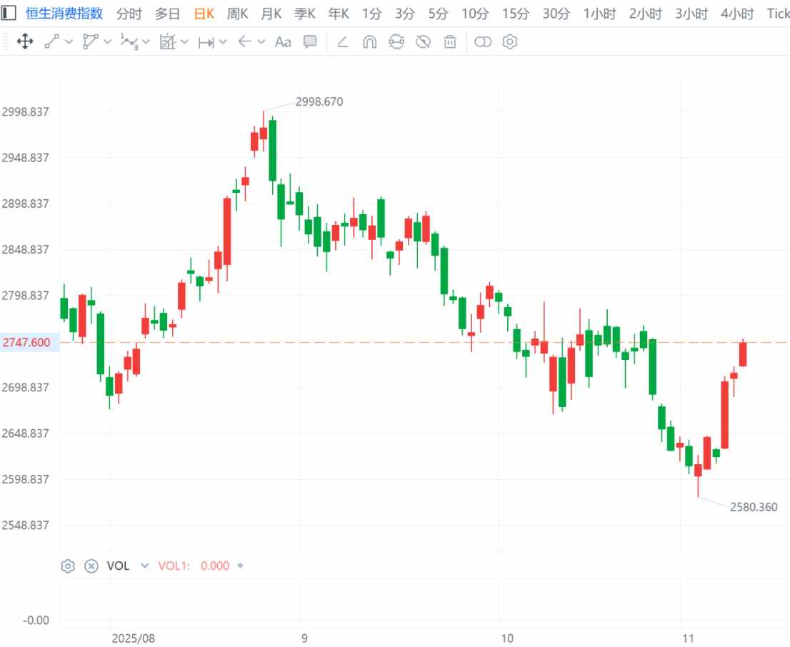 智通财经APP观察到,在最近触及2580.36点阶段性低点以来,恒生消费指数基本实现近6个交易日的持续反弹。