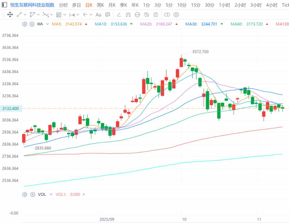 不过在二级市场,虽然在今年9月,恒生互联网科技指数走出了一波明显的拉升行情,也触及了3572.70点的年内高点,但自10月以来指数同样回调明显。从技术面来看,经过10月上半月的连续技术性回调后,恒生互联网科技指数在10月17日盘中一度跌至60日均线下方,这也是今年下半年该指数首次跌至60日线以下,进入11月后指数更是基本在60日线下方运行。