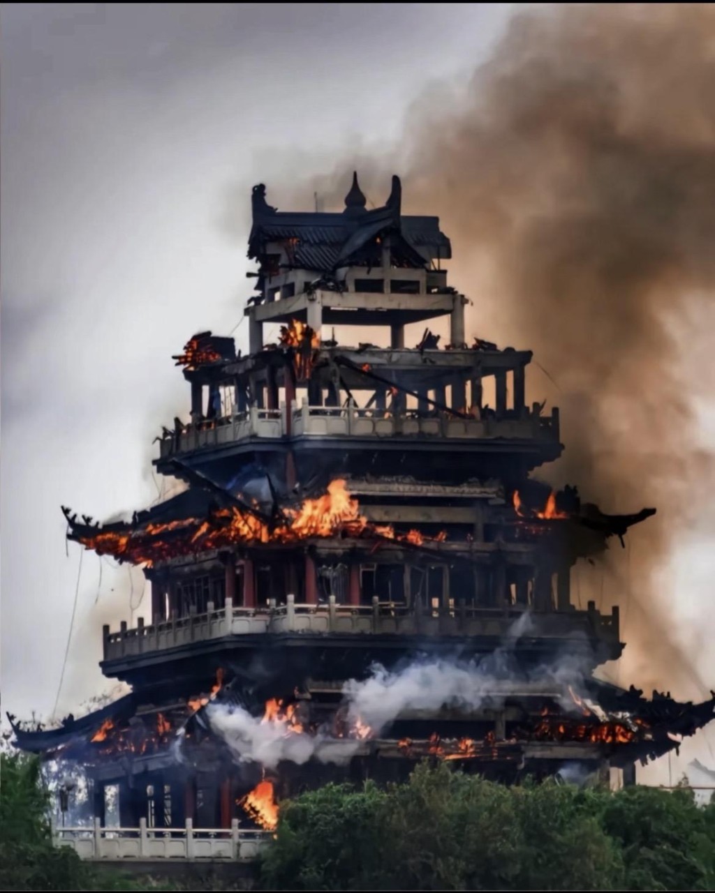▲江苏1500年古剎永庆寺火警,仿古重建的文昌阁烧通顶。抖音@橙子带仔逛游扬州