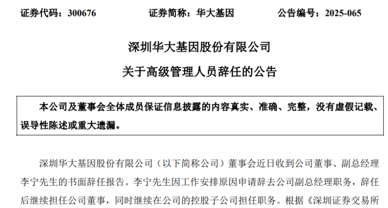11月12日,华大基因(SZ300676)发布人事变动公告,宣布李宁辞去副总经理职务。