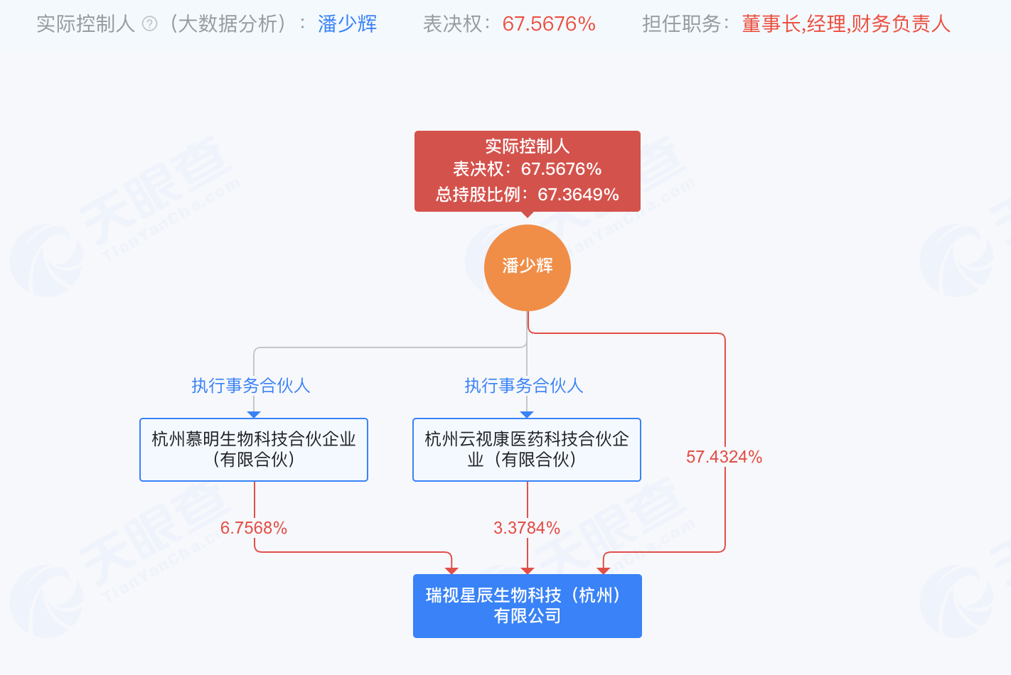 天眼查显示,瑞视生物实际控制人为潘少辉,总持股比例及表决权均为67.57%。目前,潘少辉担任公司董事长、经理及财务负责人。