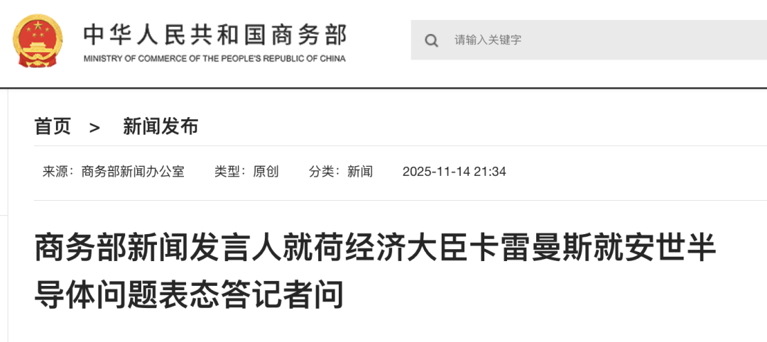 11月14日,商务部新闻发言人就荷经济大臣卡雷曼斯就安世半导体问题表态答记者问。