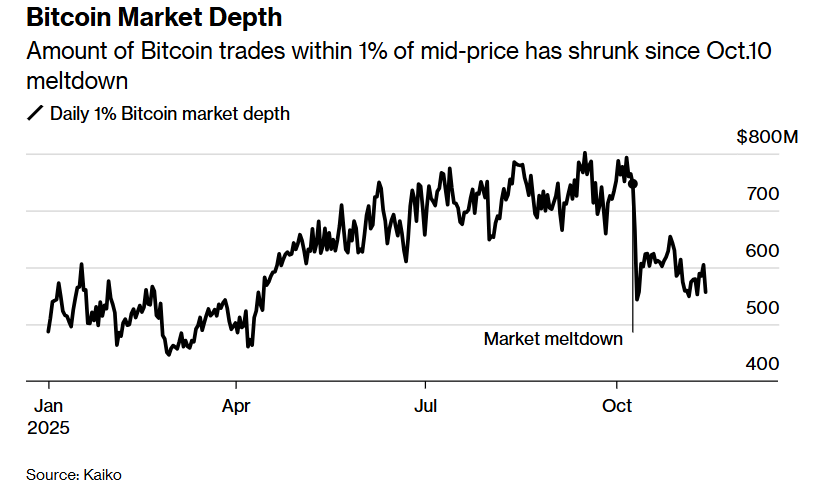 加密货币市场的流动性也大幅趋紧。根据Kaiko的统计数据,市场深度——即市场在不出现大幅波动的情况下吸收大额交易的能力——较今年高点大幅下降了约30%。