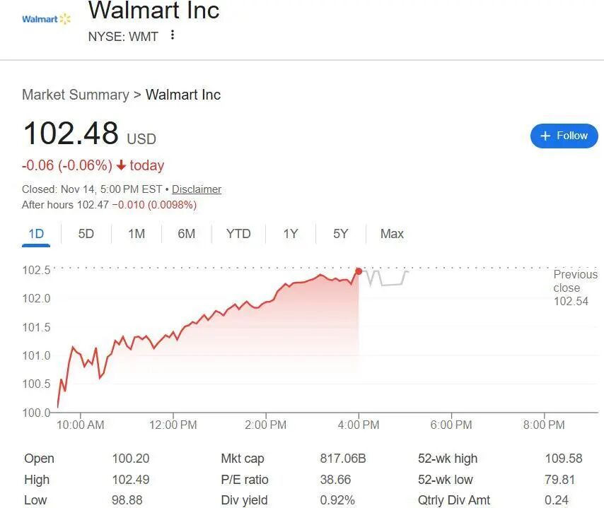 受此消息影响,沃尔玛股价周五低开,盘初刷新日低时日内跌约3.6%,此后持续收窄跌幅,收跌0.06%,连跌两日。