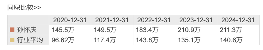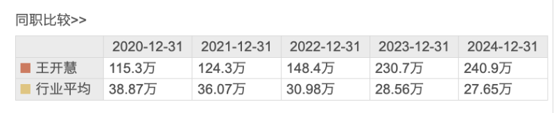 东方财富数据显示,2020年至2024年,孙怀庆薪酬分别为145.5万元、149.5万元、183.4万元、210.9万元、211.3万元;王开慧薪酬分别为115.3万元、124.3万元、148.4万元、230.7万元、240.9万元。