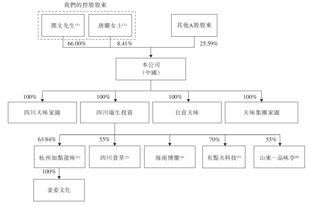 递表前,邓文直接持有天味食品66%股权,唐璐持股8.41%,二人合计控制公司74.41%股权。