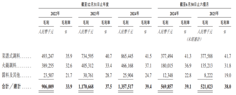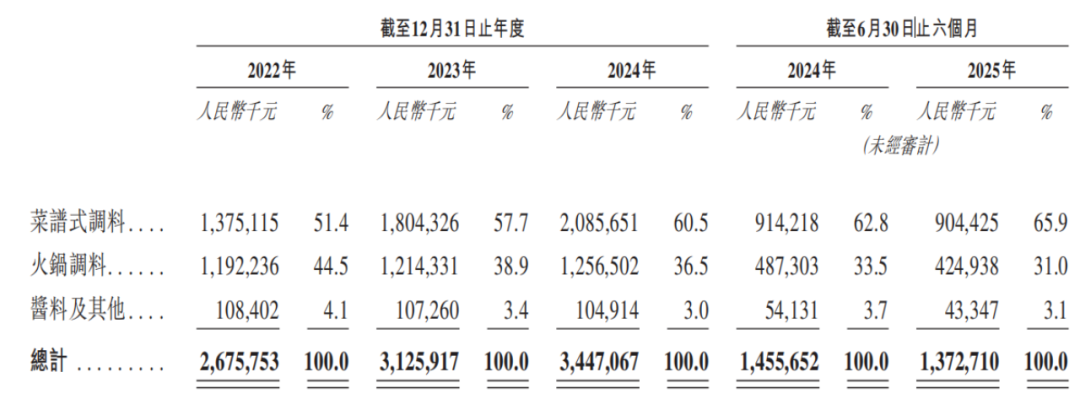 火锅调料是第二大收入来源,增长略显疲态。2023年及2024年,该收入增速分别只有1.85%、3.47%;2025年上半年,甚至出现下滑的情况,同比下降12.8%至4.25亿元。同时,该收入占比也持续下滑,由期初的44.5%降至期末的31%。