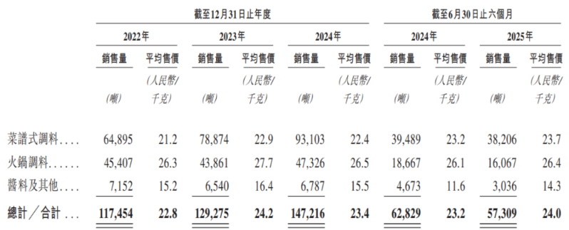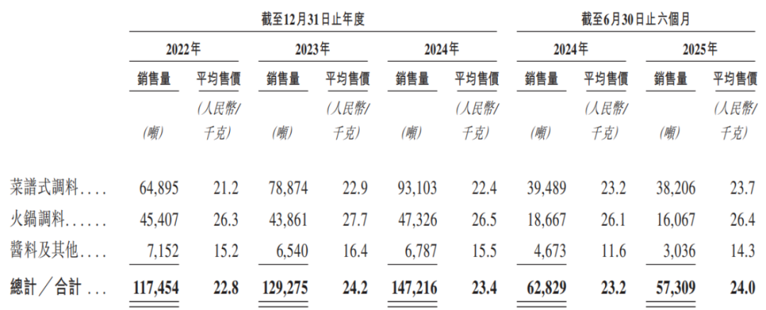 报告期内,公司产品在常规包装规格下的建议零售价范围为,火锅调料13.9元-39.9元,菜谱式调料7.9元-39.9元,酱料及其他7.0元-21.9元。此外,定制化产品的规格及定价将根据与相关客户签订的协议确定。