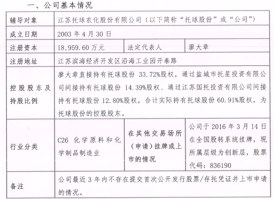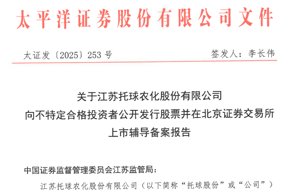 11月13日,江苏托球农化股份有限公司(以下简称“托球股份”)在江苏证监局启动IPO辅导,拟北交所上市,辅导机构为太平洋证券。