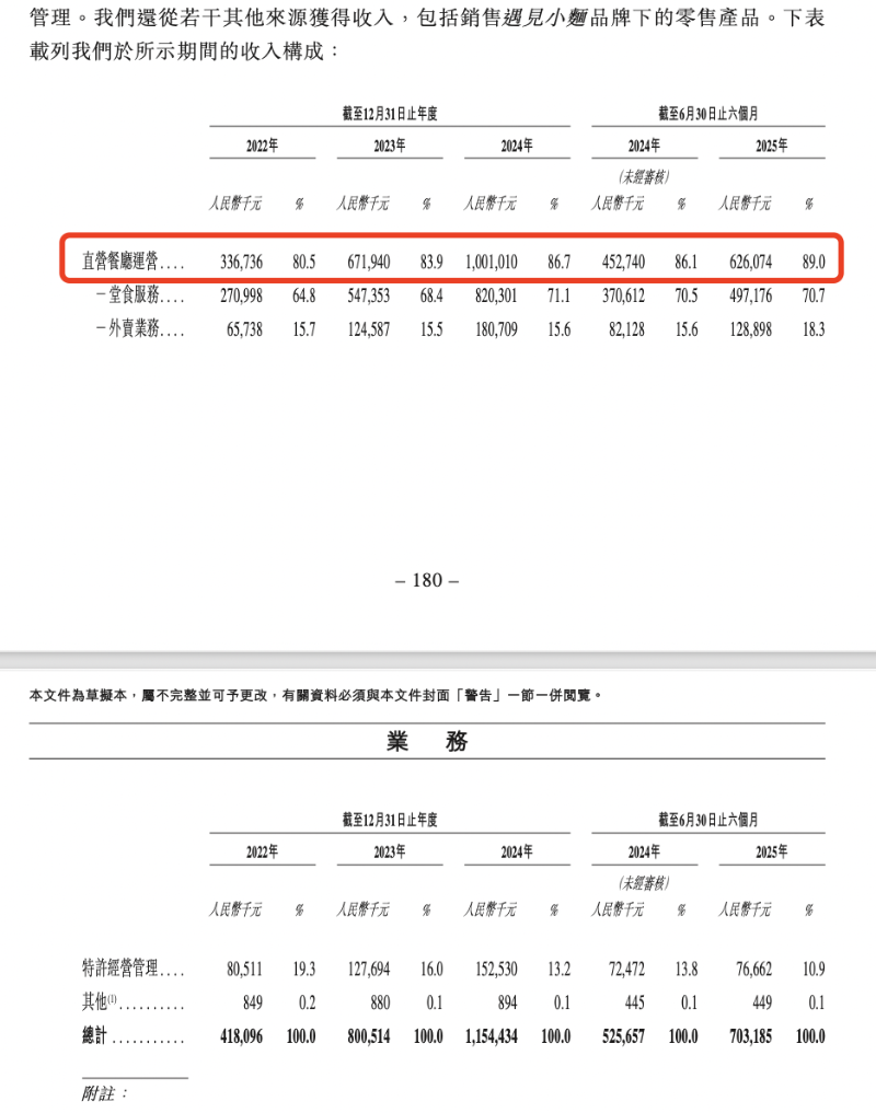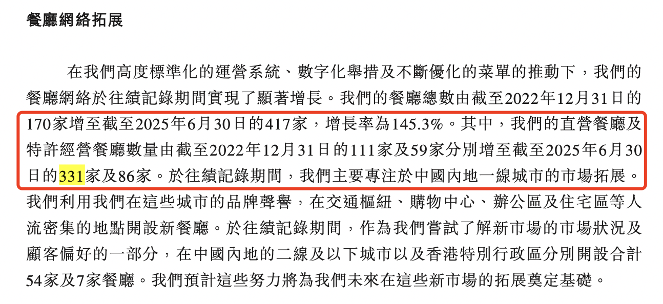 而遇见小面的餐厅总数由截至2022年12月31日的170家增至截至2025年6月30日的417家,增长率为145.3%。其中,公司的直营餐厅及特许经营餐厅数量由截至2022年12月31日的111家及59家分别增至截至2025年6月30日的331家及86家。