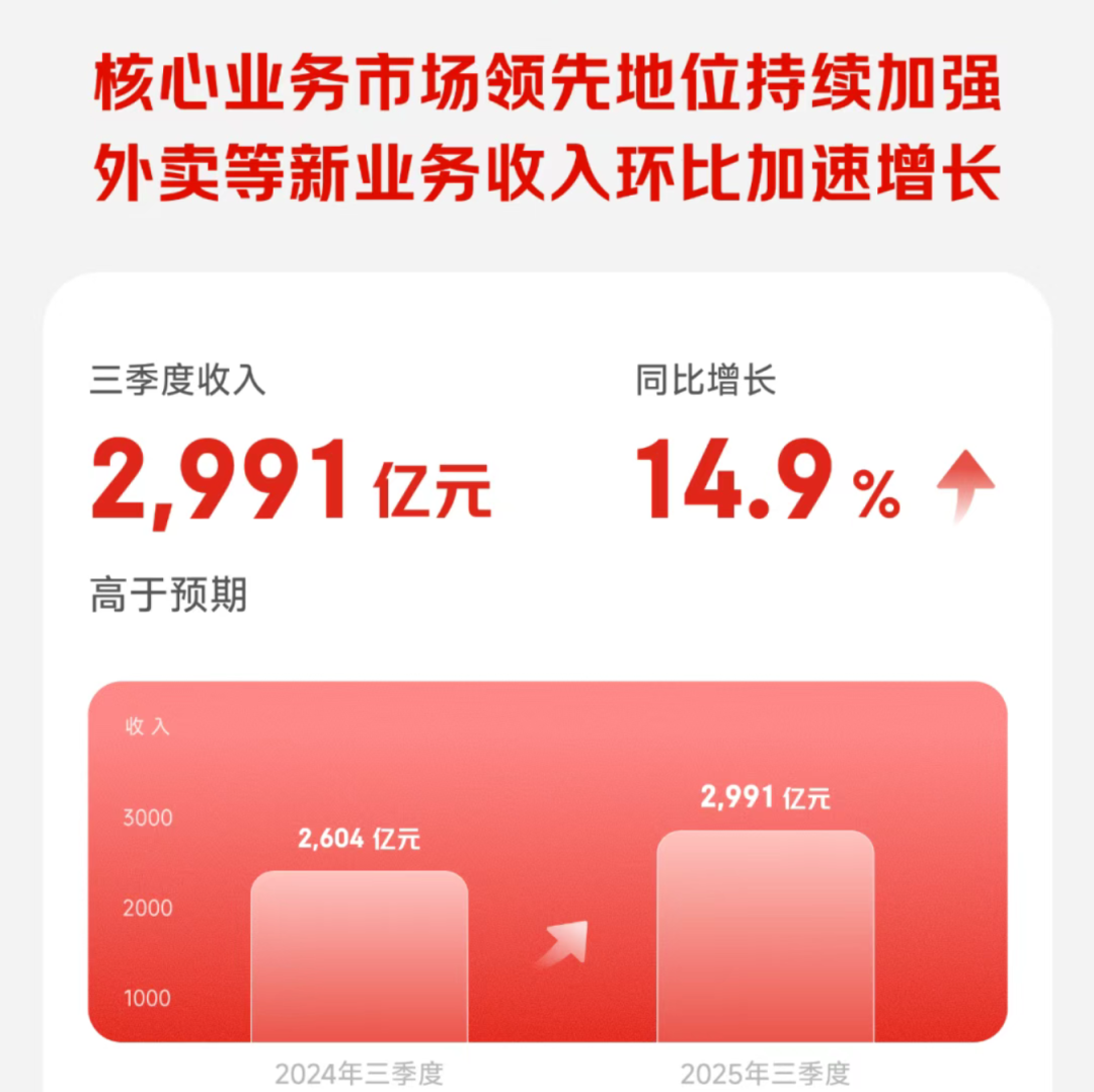 财报显示,2025年第三季度,京东收入2991亿元,同比增长14.9%;受新业务战略性投入影响,归属于普通股股东的净利润为53亿元。其中,备受外界关注的京东外卖单均损益改善明显,京东也希望以短期投入换来长期协同效应,最终让外卖业务成为可以独立生存的业务。