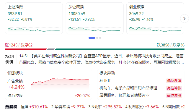 板块方面,AI应用概念全天强势,福石控股、宣亚国际双双20cm涨停;美容护理板块尾盘拉升,敷尔佳、芭薇股份等多股上涨;半导体板块活跃,龙讯股份20cm涨停;下跌方面,煤炭股全天调整,云煤能源、宝泰隆跌停;电池板块全天调整,华盛锂电、海科新源等多股跌超10%;有色股集体调整,海南矿业(12.860, -1.43, -10.01%)跌停。总体来看,个股呈普跌态势,下跌个股超4100只。