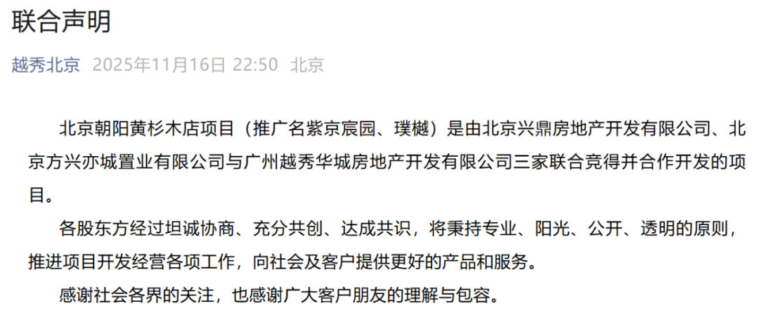 11月16日晚间,中建智地与越秀地产、金茂等联合发布声明,称已就北京朝阳区黄杉木店地块的营销纠纷达成共识。