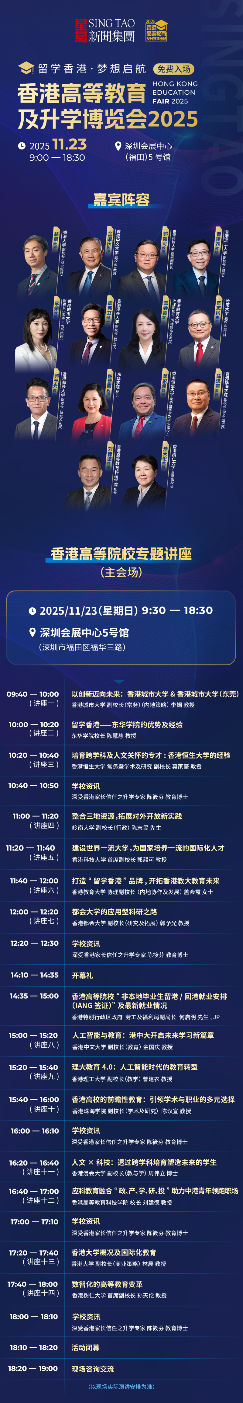 香港高等教育及升学博览会2025,由深圳市教育局指导,香港特区政府教育局支持,星岛新闻集团主办。本届论坛嘉宾阵容强势加码,15所香港高校校长亲临现场,面对面畅谈香港高校特色,分享赴港升学一手资讯,干货讲座不容错过。