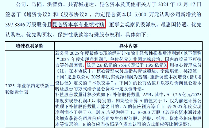 2024年12月,昆仑资本以12.57元/股的价格,向上海超导投资5000万元,并附带一份苛刻的对赌条件:若公司未能上市,昆仑资本特殊权利恢复,若2025年扣非净利润低于1.95亿元,则需重新调整增资投前估值,并向昆仑资本无偿补偿相应股份。