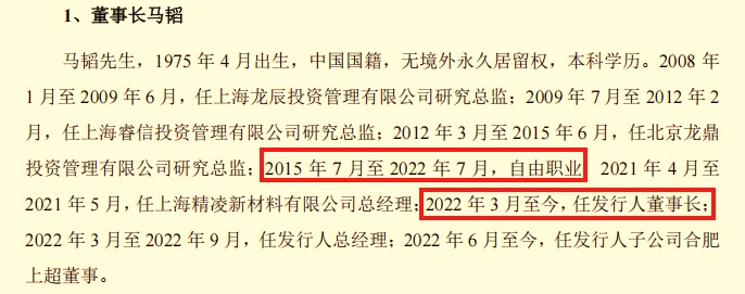 值得注意的是,上海超导现任董事长马韬履历尤为“扎眼”。招股书信息显示,马韬主要在投资领域活动,无专业技术背景,2022年之前为自由职业,当年入职上海超导即担任公司董事长。