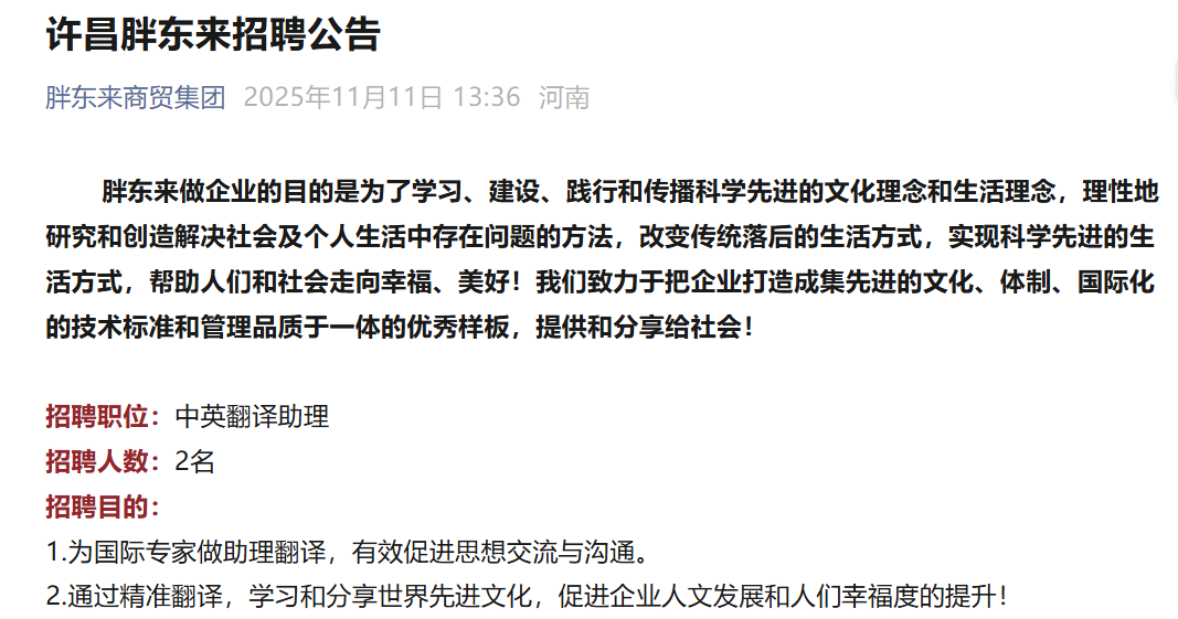 于东来此前公开的工资表亦透露过,胖东来店长职务的月薪超7.8万元,基层员工月收入近万元。新近一则招聘公告显示,中英翻译助理职务,带薪休假不低于60天,年薪不低于50万元,女性,年龄放宽至40周岁及以下。