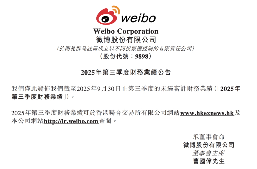 11月18日晚间,微博发布2025年第三季度财报。三季度微博总营收4.423亿美元,约合人民币31.56亿元,其中广告营收3.754亿美元,约合人民币26.77亿元,三季度调整后运营利润1.32亿美元,约合人民币9.37亿元。