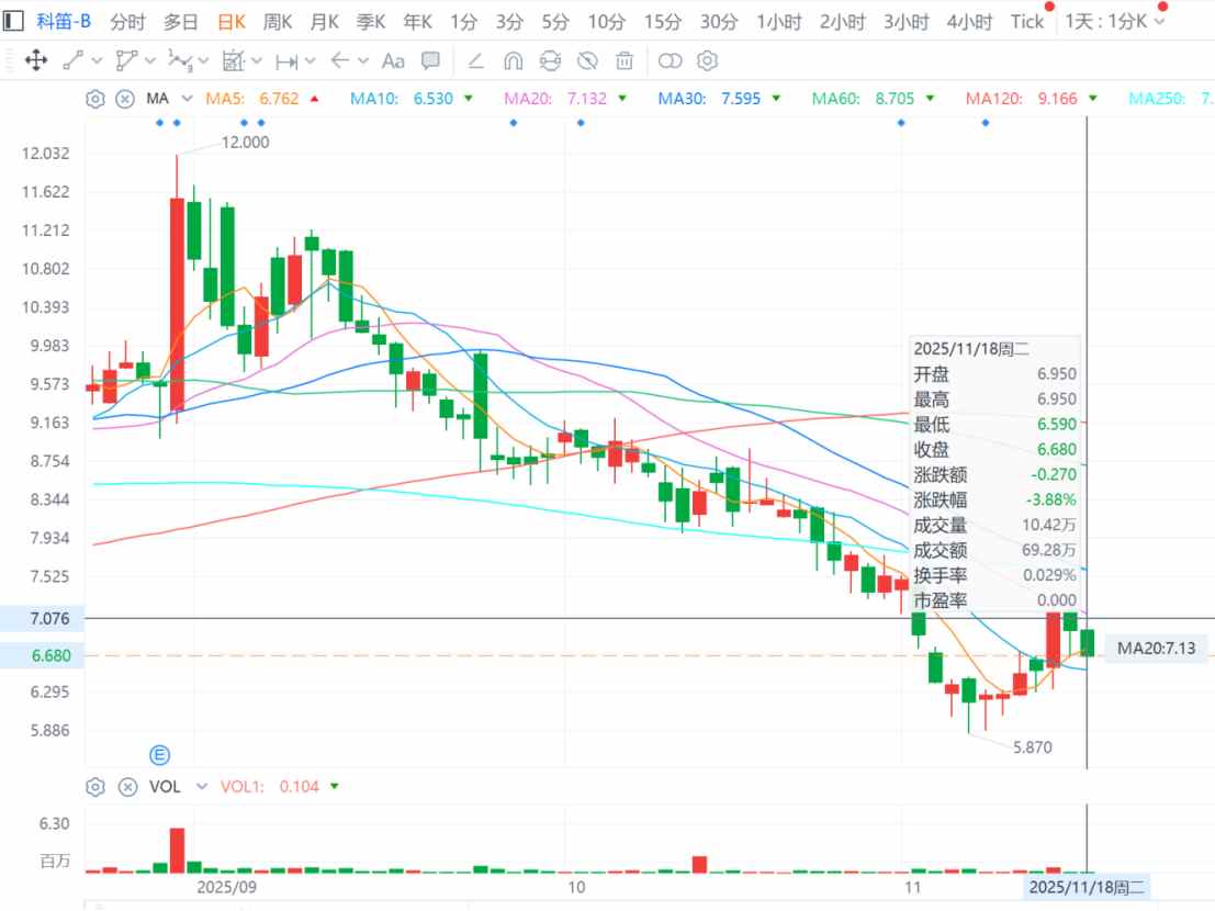 8月29日,在拉出一根20cm阳线也未能突破前高后,科笛股价开始了新一轮的下跌行情,接下来2个多月时间从最高12港元跌至最低仅有5.87港元,最大跌幅达到51.08%。