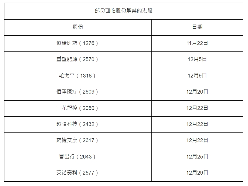 近期港股整体呈现震荡偏弱走势,除了联储局12月减息预期降温,以及中日关系外,潜在的解禁压力也成为影响港股走势的重要因素。 除了宁德时代之外,紧随其后面临大额解禁的公司还有毛戈平(1318)、越彊科技(2432)、曹出行(2643)及英诺赛科(2577)等。