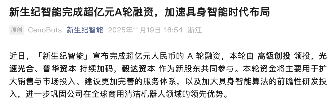 11月19日,新生纪智能宣布完成超亿元的A轮融资,本轮由高瓴创投领投,光速光合、普华资本持续加码,毅达资本作为新股东共同参与。