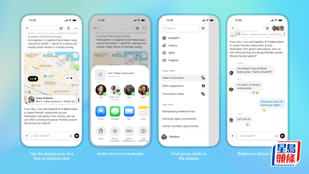 目前,用户可生成链接邀请最多20人加入,群组功能适用于规划旅行、寻找餐厅或工作协作等场景。 OpenAI强调,已教ChatGPT新的社交礼仪,AI会根据对话节奏和背景信息,判断何时该“搭嘴”回覆,何时保持沉默; 用户亦可透过“@ChatGPT”直接点名AI发言。 此外,AI更懂得使用Emoji回复。