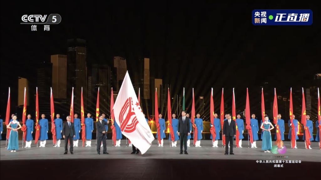 【20:37】全运会会旗从澳门特首岑浩辉传到香港特首李家超手上,再传给广东省省长孟凡利及国家体育总局局长高志丹,最后交给十六届全运会主办地湖南省的省长毛伟明。