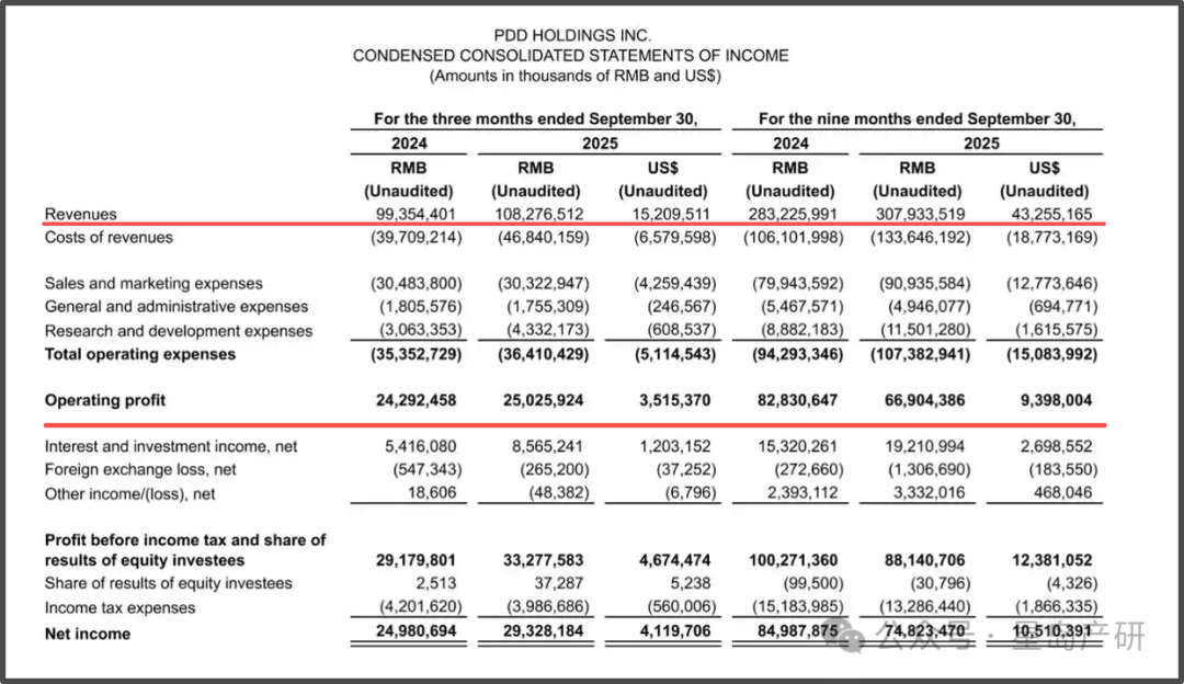 三季报显示,拼多多总营收为1082.8亿元人民币,同比增长约9%,延续了2024年以来的放缓趋势;经营利润(非GAAP)为250.26亿元,同比增速仅为3%;归母净利润为293.28亿元,同比增长17.4%,但环比减少了4.63%。
