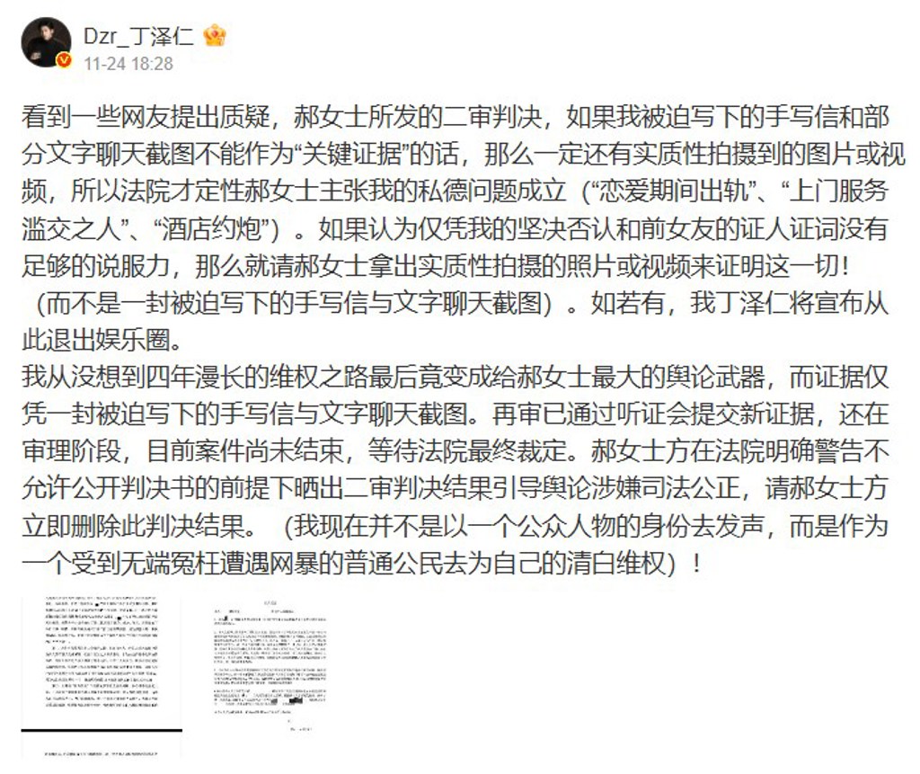 丁泽仁在微博发文揭开与郝姓女子多年的纠葛,对方一开始以粉丝身分接近他,到给予事业的协助,让他内心充满感激,没想到对方得知自己恋爱后,竟扬言要毁掉他。为了安抚郝姓女子的情绪,他被迫写下不实的“手写信”,却换来长达一年的精神控制、言语羞辱。丁泽仁公开多项对话纪录,内容包括郝女士要求每日必须完成3次视讯报到,以及延迟回覆后遭谩骂讯息,像“鸭”、“狗东西”,甚至要求他去“自宫”,就会原谅犯下的过错。