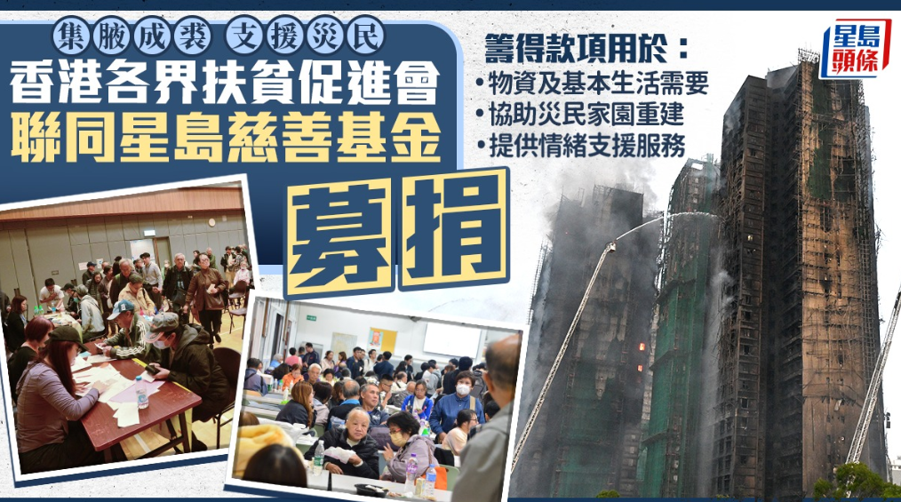 香港各界扶贫促进会联同星岛新闻集团慈善基金,全力连系社会各界人士,为宏福苑火灾中流离失所、痛失至亲的灾民筹集善款,提供最及时的援助。