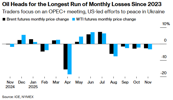 原油价格正面临两年多来最长的月度连跌周期,交易商正密切关注本周末举行的OPEC+会议,并评估美国主导的结束乌克兰冲突的外交努力。