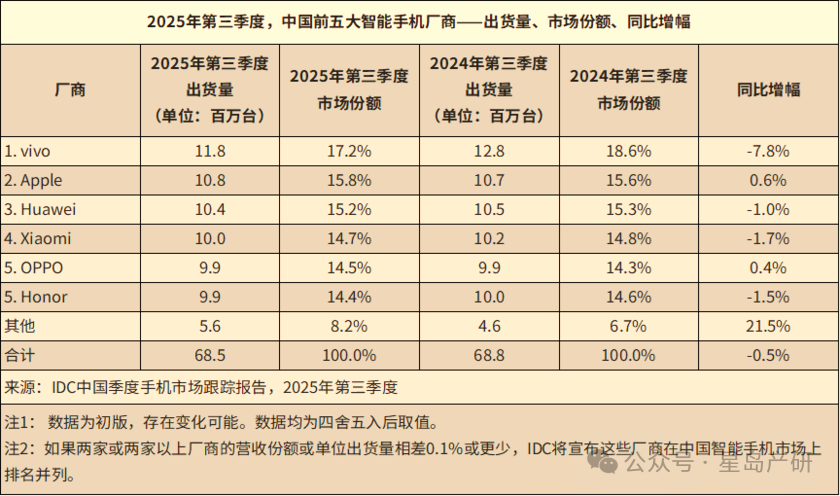 市场数据直观反映了这一颓势:IDC数据显示,2024年一季度荣耀仍以17.1%的份额稳居国内第一,但后续三个季度连续下滑,全年份额跌至14.9%(排名第四),同比下滑8.1%;2025年三季度份额进一步降至14.4%,排名滑落至第五,同比下滑1.5%,即将跌入“others队列”。