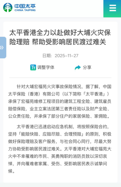 针对大埔宏福苑火灾事故保险情况,中国太平声明指,太平香港承保了宏福苑维修工程项目的建筑工程全险、建筑僱员赔偿保险,业主立案法团第三者责任险以及财产全险、公众责任险,并承保了部分住户的家居保险、家佣险。太平香港将按照保险合约,坚持“能赔快赔、应赔尽赔、合理预赔”的原则,强调做好保险理赔及客户服务。