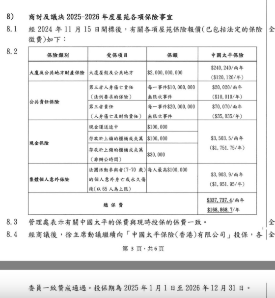 记者亦查看宏福苑业主立案法团网站公开文件,发现去年11月及12月的第7、8次全体委员会议记录,均显示宏福苑的屋苑综合保险由太平香港承保。