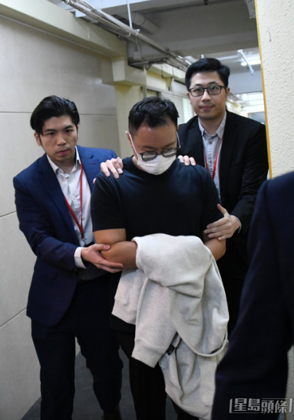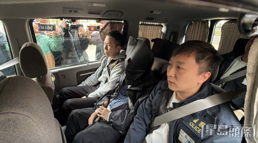 ▲另一名男子双手包裹外套被押到九龙湾办公室调查。杨伟亨摄