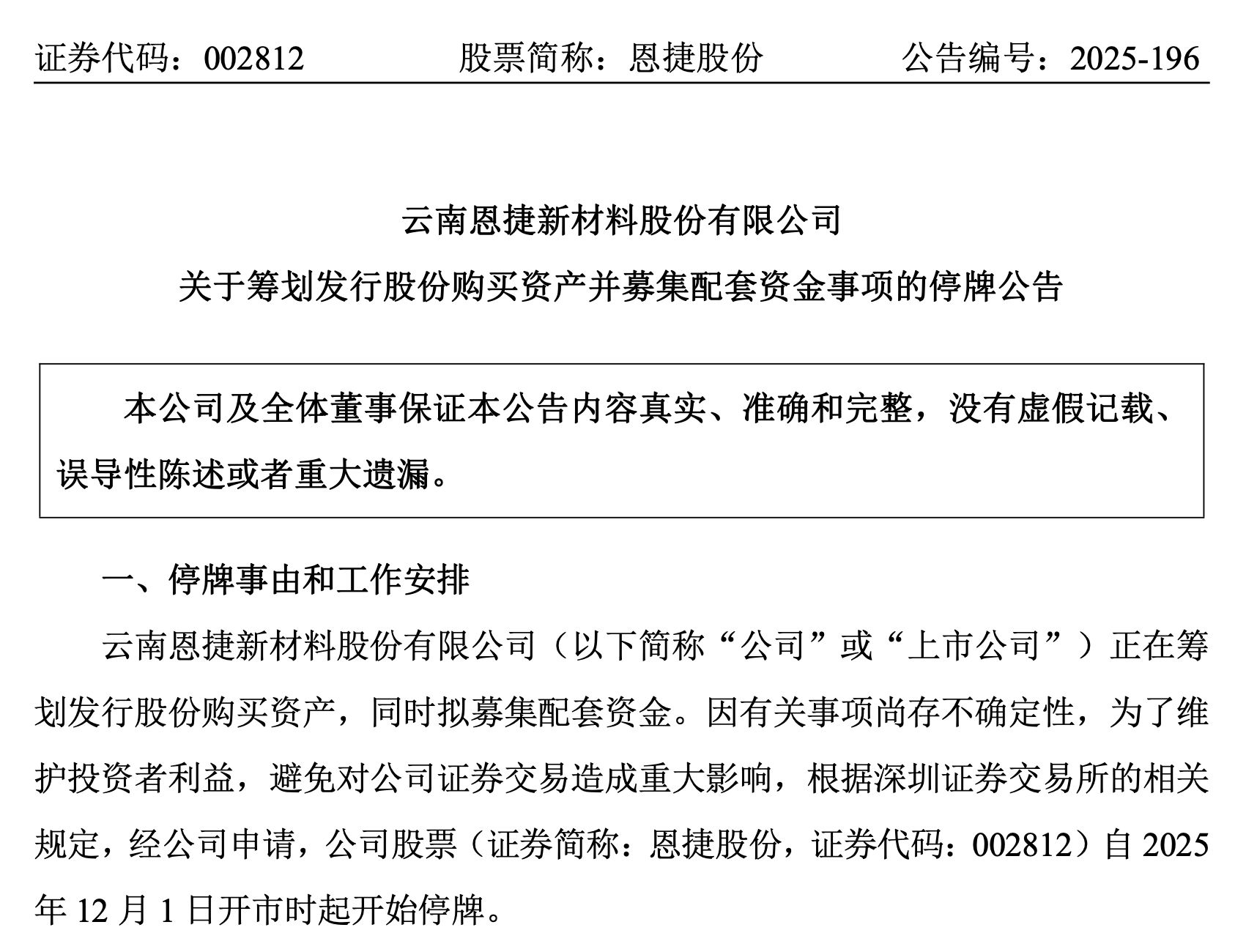 11月30日,恩捷股份(002812.SZ)公告称,公司正在筹划发行股份购买资产,同时拟募集配套资金。本次交易的标的公司为青岛中科华联新材料股份有限公司。公司与本次交易的部分主要交易对方已签署了《关于收购青岛中科华联新材料股份有限公司股份之意向协议》,初步达成购买资产的意向。因有关事项尚存不确定性,为维护投资者利益,避免对公司证券交易造成重大影响,公司股票自2025年12月1日开市时起开始停牌。预计在不超过10个交易日的时间内披露本次交易方案。