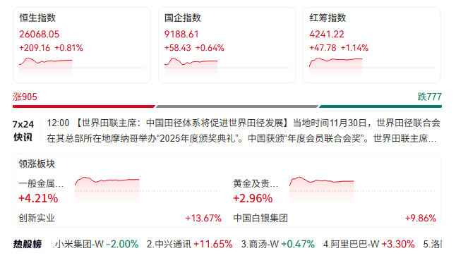 12月1日消息,港股三大指数集体上涨。截至午间收盘,恒生指数涨0.81%,报26068.05点,恒生科技指数涨0.99%,国企指数涨0.64%。